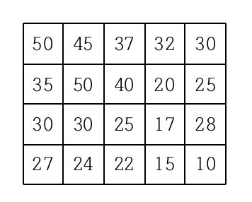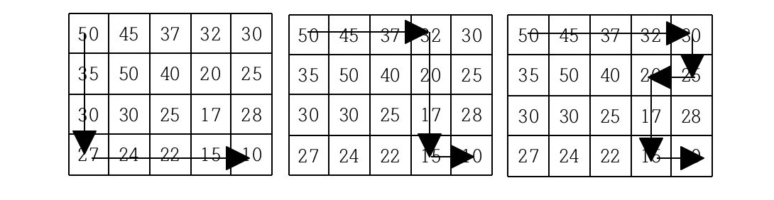 현재 제일 왼쪽 위 칸이 나타내는 지점에 있는 세준이는 제일 오른쪽 아래 칸이 나타내는 지점으로 가려고 한다. 그런데 가능한 힘을 적게 들이고 싶어 항상 높이가 더 낮은 지점으로만 이동하여 목표 지점까지 가고자 한다. 위와 같은 지도에서는 다음과 같은 세 가지 경로가 가능하다.